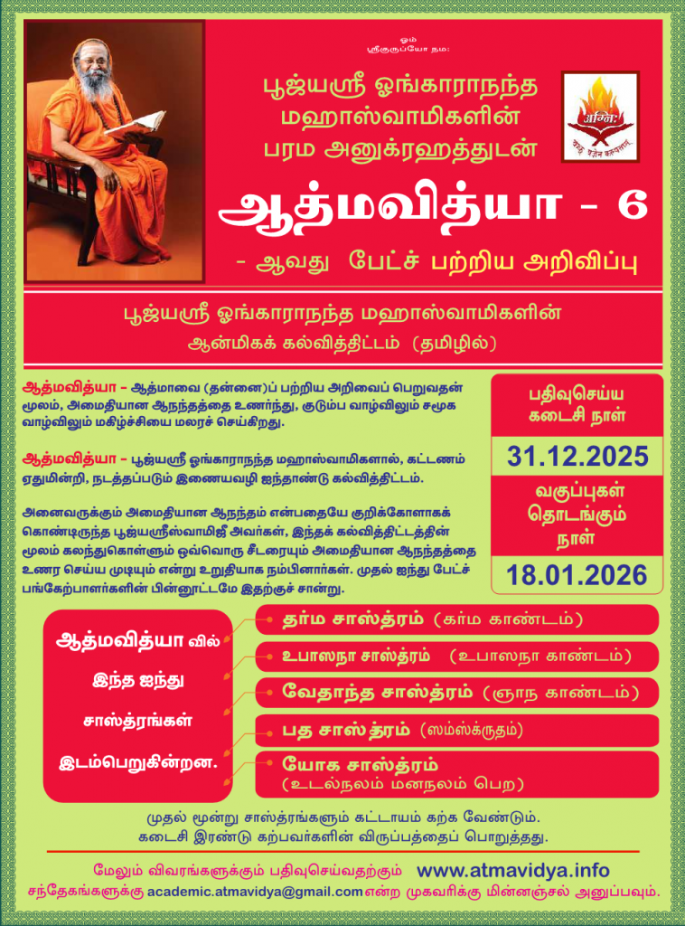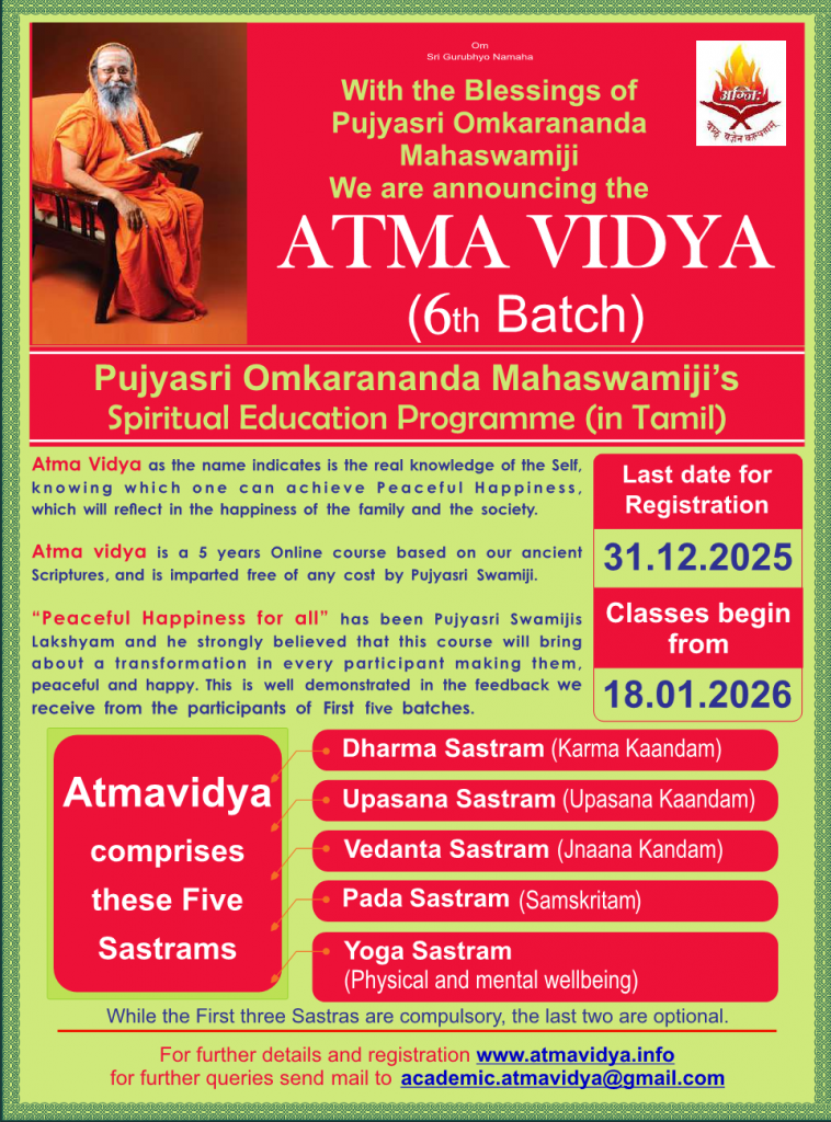 Pujyasri Omkarananda Swamiji created this wealth of spiritual knowledge and wanted the entire humanity to benefit from it. He had a disciplined structure of teaching in mind which took shape as “Atma Vidya” course.